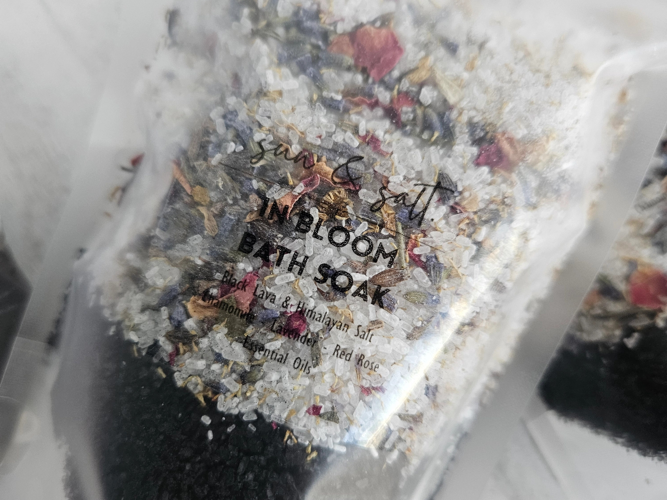 In Bloom Bath Soak- Bloom, baby, BLOOM! This beauty cocktail of nature is SO GOOD. It doesn't just offer a feeling of completely revamped but it looks like magic. This is my #1 "treat yourself" at home getaway. Black Lava Salt - Epsom Salt - Chamomile - Lavender - Red Rose - Essential Oils
