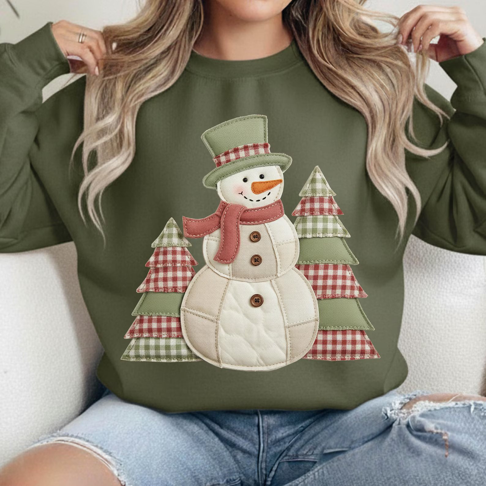 Plaid trees, a smiling snowman, and festive flair? Yes please. The Patchwork Snowman Tee features a cheerful snowman in a top hat and scarf, surrounded by patchwork-style Christmas trees in red, green, and beige. It’s a cozy nod to classic holiday decor with a playful twist—perfect for cocoa sipping, tree trimming, or gift wrapping in style.