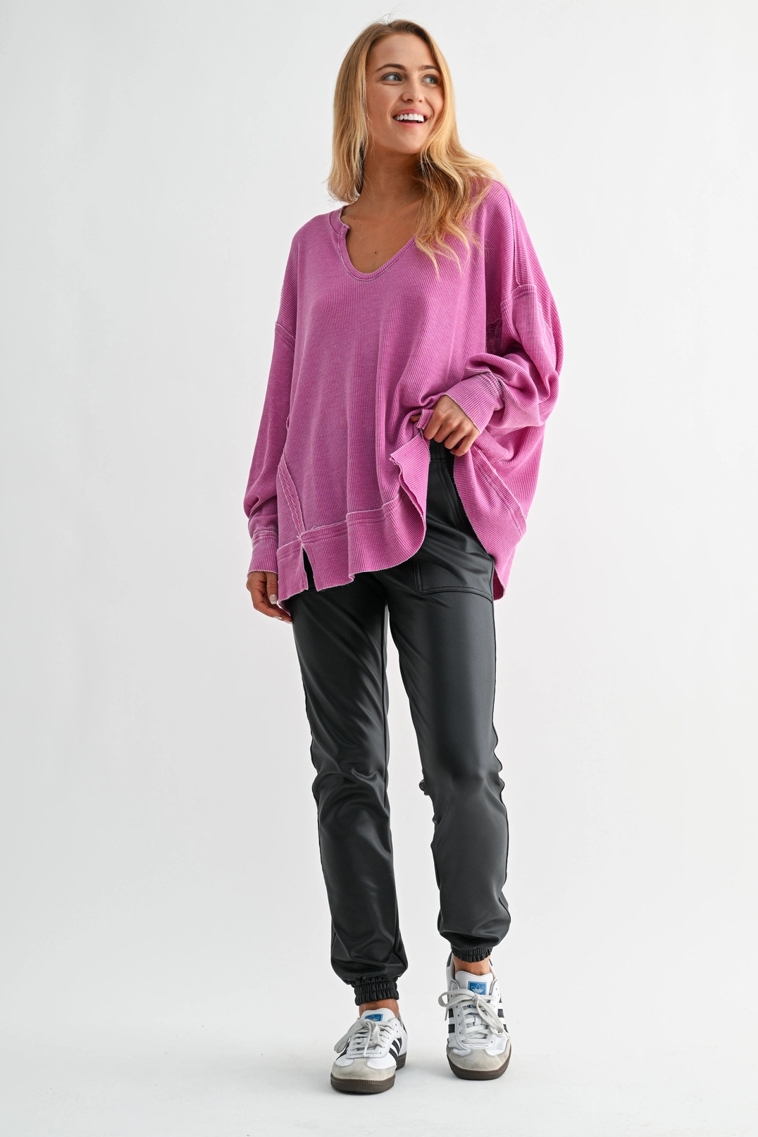 Effortless meets edgy in this mineral-washed waffle-knit top, designed for comfort with a fashion-forward silhouette. Raw seam edges and hemline slits give it a lived-in vibe, while inverted pleats at the cuffs add subtle volume to the sleeves. Whether layered over leggings or styled solo with denim, this piece brings texture, movement, and streetwise charm to your everyday wardrobe.
