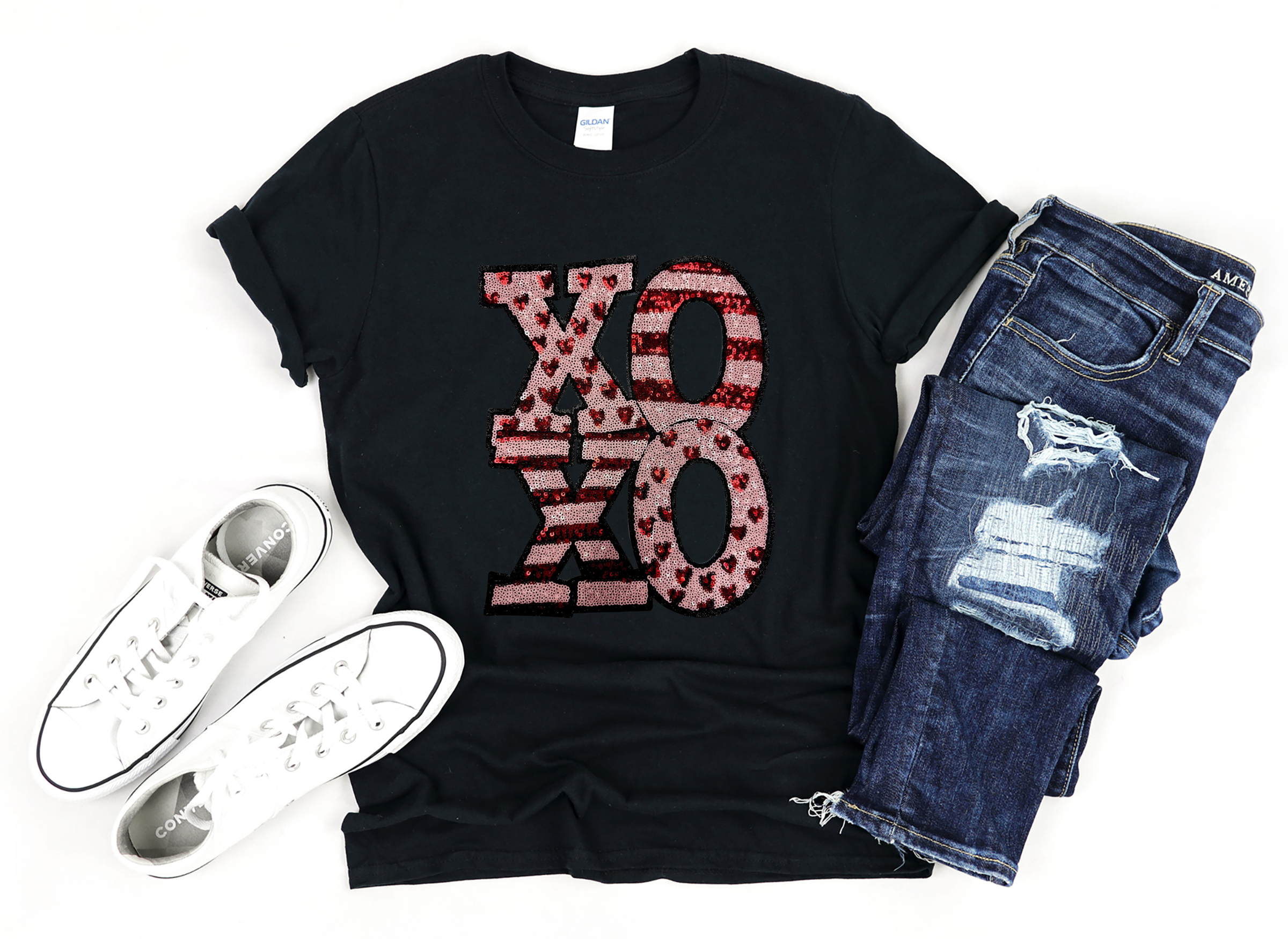Say it loud, say it sparkly! The XOXO Tee features bold letters in leopard print, glitter hearts, and red-striped accents—all brought to life with a real sequin patch, not a transfer. It’s playful, tactile, and perfect for Valentine’s Day or any day you want to spread the love.